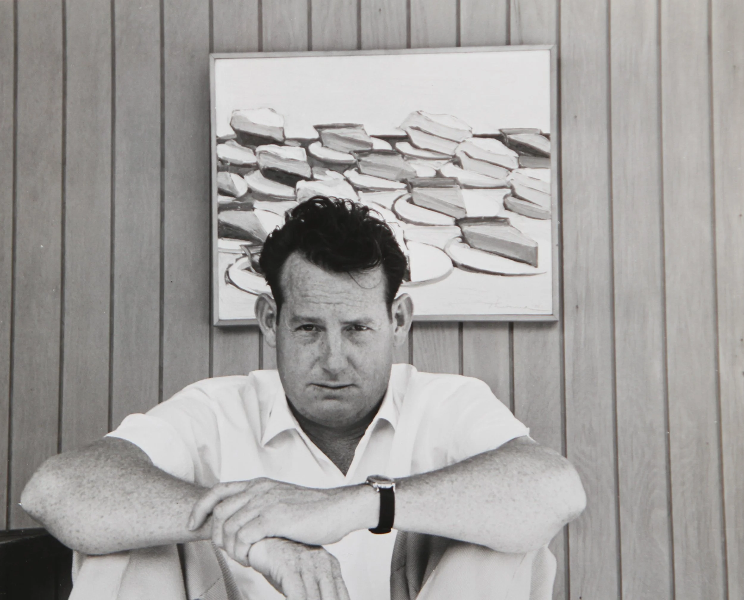 Wayne Thiebaud in his studio in Sacramento with his painting Pies in the background, 1961. Photographer: Betty Jean Thiebaud. Collection of the Wayne Thiebaud Foundation. © Wayne Thiebaud/VAGA at ARS, NY and DACS, London 2025