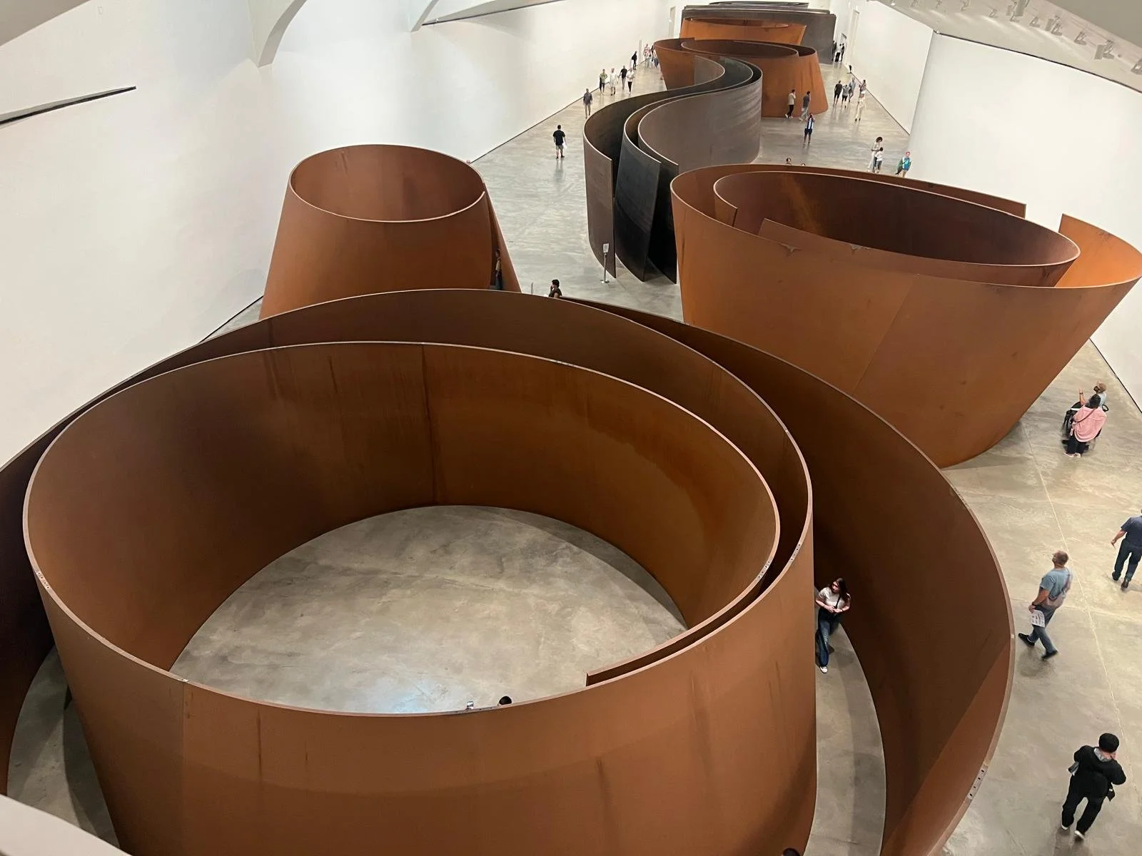 In the more conceptual works, interesting optical effects, such as lights blinking or words changing, usually engaged him on some level. The one he engaged with most was sculptor Richard Serra’s monumental work The Matter of Time, on permanent display in the museum’s largest gallery. It consists of eight enormous, rusted steel double ellipses, spirals and tilted, snaking walls, that viewers are encouraged to walk around and through.